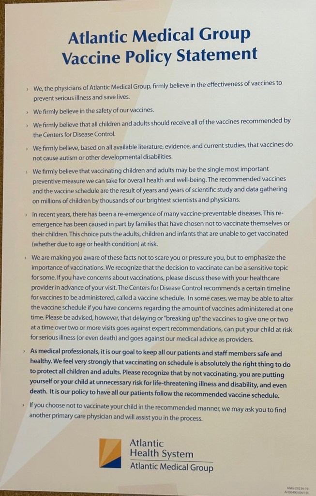 I recently came across this photo from a pediatrician’s group office and it’s been niggling at the back of my mind for the past several days so I thought it might be useful to take it point by point and respond to the belief statements with actual evidence since (as is typical) there is not a shred of science cited on this statement.